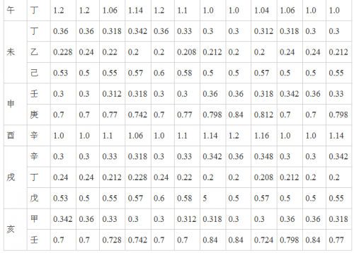 五行数值说明:如寅月甲木七分,丙火三分,甲的强度为1.0+0.2*0.7=1.14,甲木生火,则火应加上木,丙的强度为1.0+0.2*0.7+0.2*0.3=1.2。依此类推,下表同。