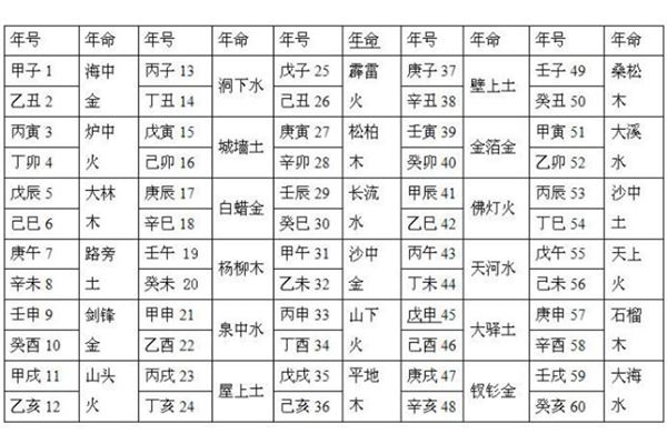 甲子乙丑海中金 丙寅丁卯炉中火 戊辰己巳大林木 庚午辛未路旁土 壬申癸酉剑锋金