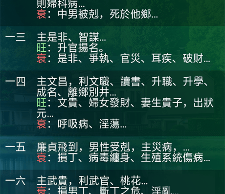 (2)九星组合吉凶及应事:25主病符;23为斗牛煞;67为交剑煞;37为官非争斗;55为病;22为病;57为身体生病;59为紫黄毒药;14主科甲;16主名利官运;68主财生官;78主财生官;89主财运。