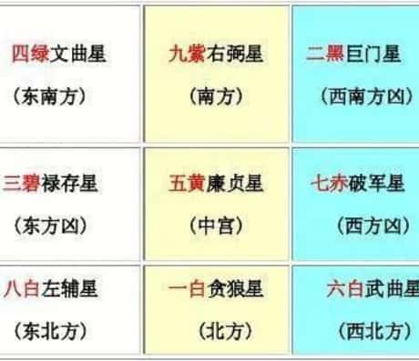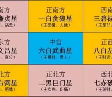 2,九星的名称及方位:“一白”为贪狼星,在北方;“二黑”为巨门星又称病星,在西南方;“三碧”为禄存星,在东方;“四绿”为文昌星,在东南方;“五黄”为廉贞星,在中宫;“六白”为武曲星,在西北方;“七赤”为破军星,在西方;“八白”为左辅星,在东北方;“九紫”为右弼星,在南方。这是九星在地盘(元旦盘)上的原始方位。