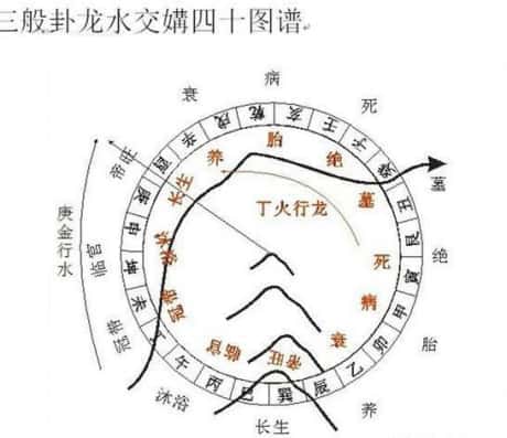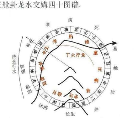 八宫行龙图中,西方四式左向右旋是庚金行水巳起长生顺排,丁未来水去癸丑是斗牛纳庚丁之气,南方四式右向左旋是丁火行龙酉起长生逆排,龙水同归癸丑金库,揭示了从生到死的自然过程,水之生是龙之旺,龙之生是水之旺。玄关通窍富贵绵长。