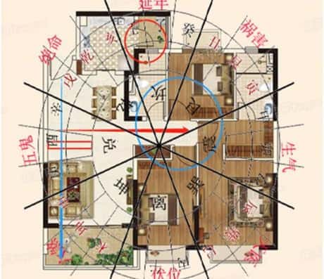 四、“八宅风水”与“玄空飞星”在评判住宅风水中的优劣性八宅法常把要评判的风水分为八宫,且其中往往同时运用九星穿宫法(或称穿宫九星法、五行穿宫法、贯井法等),截路分房等方法,针对进深重叠有宅院的组合建筑及多组院落纵横交织形成的组群宅院,穿宫是指宅门之内的仪门;贯是贯穿、贯串之意;井是指天井,即庭院。宅院进深只一层房屋为“静宅”;有二至五层房屋为“动宅”,中间有腰房或门墙分隔;有六至十层房屋为“变宅”;有十一至十五层房屋为“化宅”。这就是风水学中住宅“静、动、变、化”四格局。对于复杂的大院落,可适当增设门墙分隔使之成为多个独立的小院落,对每一套院,则可依各自的仪门为伏位,顺布游年九星或穿宫九星,仪门以外则互不相干。现代楼房的单元房实际上就是复杂大院落,必须按穿宫九星“善层”,或按截路分房法,以各自的主房门为伏位顺布游年九星。所以,八宅法对于住宅风水的分析是非常细致的,微观的,不管面积大小,均可从面至点,层层剖析,吉凶明了。相反,玄空学则在住宅风水的内部评判上,难以做到如此深度,虽从其理论上也是可以如此细分,但实际操作中却矛盾百出,难以评判。我们先来看一下玄空学理论是如何评判住宅内部风水的:当我们给一套住宅排出一个飞星盘,必须先找出山与向的旺星方位。
