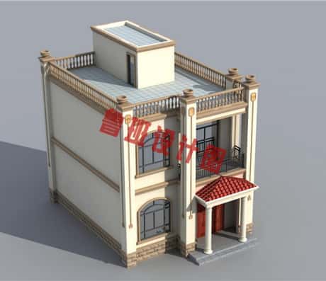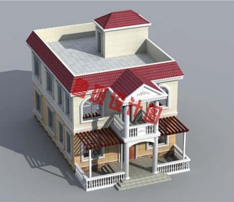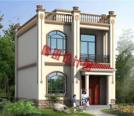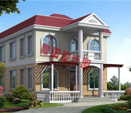 图纸介绍:120平米简单实用型农村小别墅设计图,二层屋顶为全露台,小开间,长进深,红色屋顶和米色外墙沉稳不失老气,典雅不失田园清新,窗户多为弧形造型,丰富了别墅的外立面,又保证了采光通风。