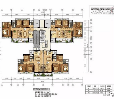 这个户型图,比之前多了楼层平面图中公区功能设置(图最下边中间小图),比如楼梯、电梯、风井、电井、水井。