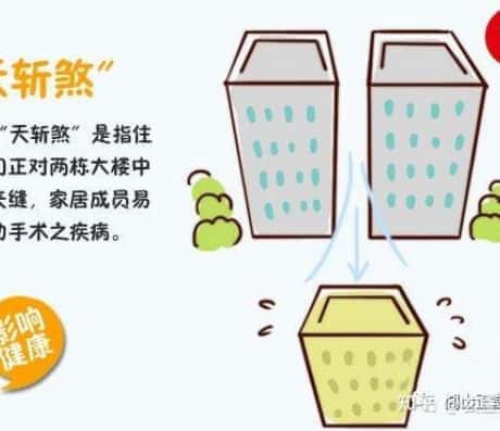 住宅大门面对两栋大楼中间的夹缝,是犯了“天斩煞”。天斩煞的影响极其强烈,住宅成员之间易起争执,易有血光之灾,或是易患需动手术之疾病。如果是店铺则财运不旺。