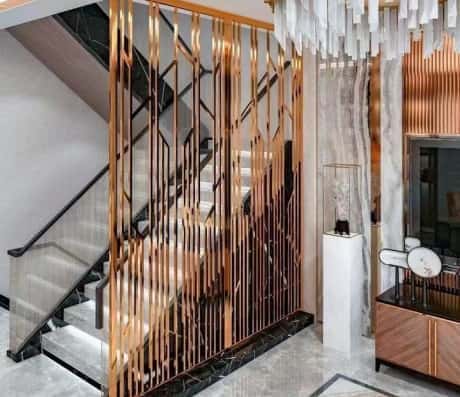 这个主要是复试的别墅或者复试套间内设计的不锈钢屏风隔断,我们有一种说法就是“开门不见梯”,但其实不是“门”见梯家居风水玄关屏风的作用,而是进门的人见梯。在客厅边上的楼梯旁边设计镂空的不锈钢屏风隔断,就是这个道理啦。