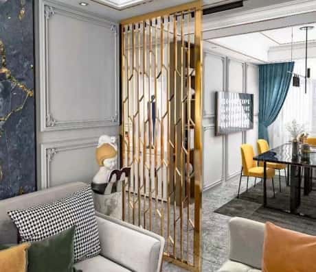 卫生间属于阴性空间,避免过重的阴气与客厅直接交流佛山禹晟不锈钢有限公司背景墙不锈钢屏风隔断装修效果图,在这里安装不锈钢屏风也是常见的设计哦。主要使用的屏风的遮挡功能,背面客人看到杂乱无章或者不雅的空间,影响人们的心境。