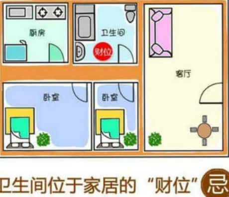 厨房作为一家大小口腹之源,须纳吉气,厕所为不洁之地,且厨房代表火,厕所代表水,水火不容,会导致夫妻失和、家口不宁。