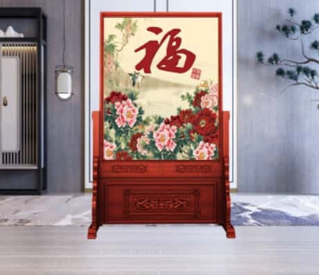 屏风的造型也很重要。在风水上,屏风上应该有龙、凤、麒麟或是寿星等吉祥图案,这些图案都代表着福气、富贵和长寿。屏风上的图案越大越瑞气,越是符合屏风所处的方位越有利于家庭的运势。