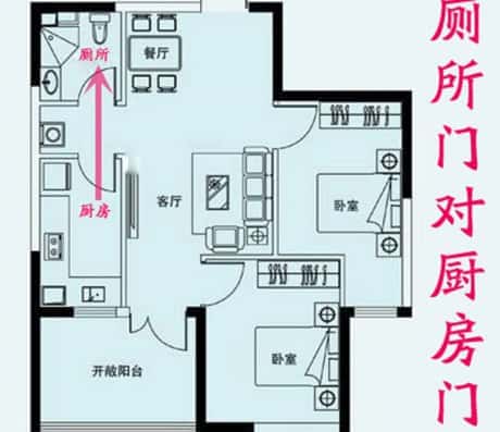 厨房门对大门,很容易形成穿堂煞,是穿堂煞中破财最严重的一种。厨房门对后门厨房位置风水禁忌,家中的钱财莫名其妙的花费会非常严重。厨房门对厕所门会造成消化系统及财务上的伤害。
