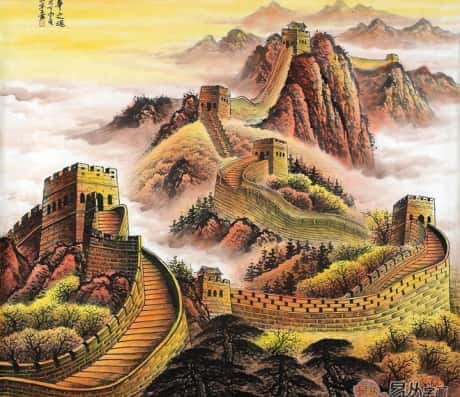 这是王宁老师的《中华之魂》金色长城画,作品中绵延万里的长城,宛如东方的巨龙一般,横亘在山脊之上,作品用暖金色绘制而成,就像一副金色的画卷在此展开,和谐盛世普天同庆。作品中的古树松柏可为主人招财档灾,也是万古长青的意思。山脉的绵延不绝寓意着龙脉的延伸,在家中挂上这副长城作品,就是家兴业旺的保障,也是一种贵族身份的象征。