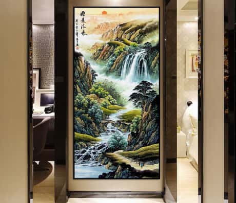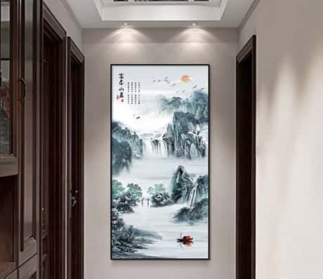 玄关挂什么风水字画招旺财运?在玄关处可以选择一幅有风水意义的国画作品,比如风水意义的山水画。水之秀,山之灵,水为财,水涌流财不断,山根基深,家族基业旺盛。并且山水画在欣赏艺术价值上又有着很高的高度,古人都崇尚山水之间怡然自得的情怀,所以玄关装饰画选择山水画更是一种恬淡闲适的情操体现。那玄关选择哪类的山水画合适呢?不要着急!小编这就给你讲解中国玄关风水字画---山水画,这五类山水画包你财运亨通达五江!