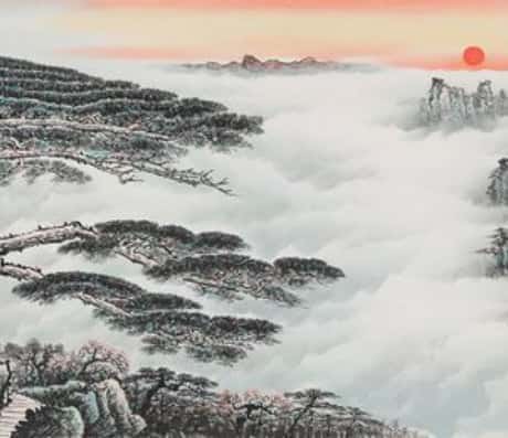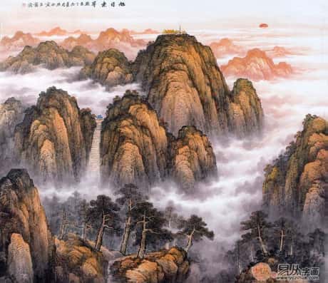 这一幅蒋伟的国画山水《迎松朝阳》,就是采用我国著名的风景区黄山迎客松中的形象,它苍劲奇秀,俊俏多姿,雍容潇洒美不胜收。画家蒋伟用****的笔墨,将这一形象跃然于纸上,又将那俊秀挺拔的黄山,以至于著名的黄山云海,全部描绘出来,用以陪衬迎客松的雄伟高大、伟岸奇秀。这幅《迎客松》,画面给人雄浑气势,让人观之顿时有一种精神力量,鼓舞我们。这幅画唯美大气、浑然天成,让人有一种震撼的感觉。这样的国画精品力作,值得推荐,更值得典藏。