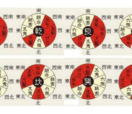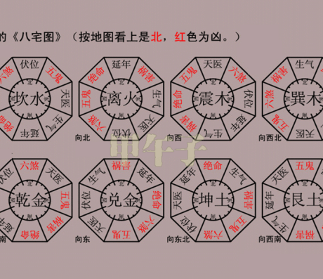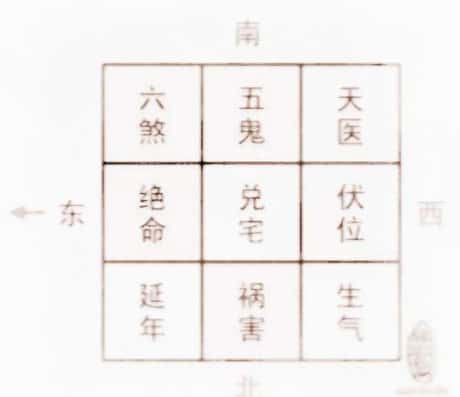 离宅:大吉(生气方)在正东方,次吉(延年方)在正北方,中吉(天医方)在东南方,小吉(伏位方)在正南方;大凶(绝命方)在西北方,次凶(五鬼方)在正西方,中凶(六煞方)在西南方,小凶(祸害方)在东北方。
