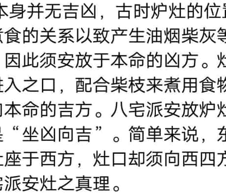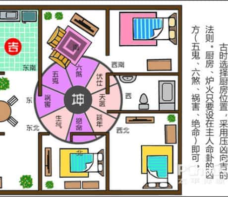 把三元做为最重要的理论依据的风水学理论只有八宅一派。四、八宅派特别强调门、灶和吉凶方八宅派对传统堪舆学中的龙、水论述很少,最为重视的是宅院中的门、灶。八宅派对门的认识是:门为一家之气神。八宅派对灶的认识是:灶为一家之食神。故八宅派人为二者至关紧要,无生气入门,则为死宅八宅派风水的吉凶判断,无食神降临,则为死人。因此要求门的朝向、灶的方位、坐向等一定要与宅中主人的年命相合。民间有“阳宅一门定乾坤”及“阳宅一灶定乾坤”的说法,就是来自于八宅派的理论。八宅派认为:同样的宅院,同样的门、灶布局,不同年命的人居住,会有完全不同的吉凶结果。这种理论有着一定的合理性。五、八宅派强调婚姻和子息八宅派很强调婚姻和子息这两项,按照中华民族的传统幸福观,夫妻恩爱、儿孙满堂是幸福之家。因为按照八宅派理论,每个人都有一个固定的年命,在择偶时要选取年命相合的来做配偶,避免与年命相违的人结为夫妻,但此法在现实社会中仅能作为参考。在中国的地理堪舆术中八宅派风水的吉凶判断,对阳宅风水的吉凶配合,东西四宅八宅派理论为一主要流派,如流行甚广的《阳宅三要》、《八宅周书》、《八宅明镜》等古代风水著作,均以此为立论根据。民间术士更是大量应用东西四宅分类,为人判定阳宅吉凶。