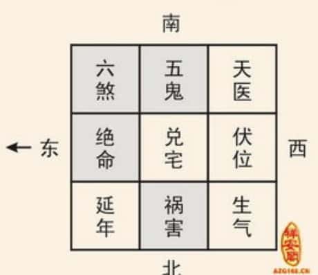 2、东四宅分别是:震宅、离宅、巽宅、坎宅;坐东向西(以站在屋中心点计算~门位在西方)坐南向北(以站在屋中心点计算~门位在北方)坐东南向西北(以站在屋中心点计算~门位在西北方)坐北向南(以站在屋中心点计算~门位在南方)坐西北向东南(以站在屋中心点计算~门位在东南方)坐西向东(以站在屋中心点计算~门位在东方)坐东北向西南(以站在屋中心点计算~门位在西南方)坐西南向东北(以站在屋中心点计算~门位在东北方)