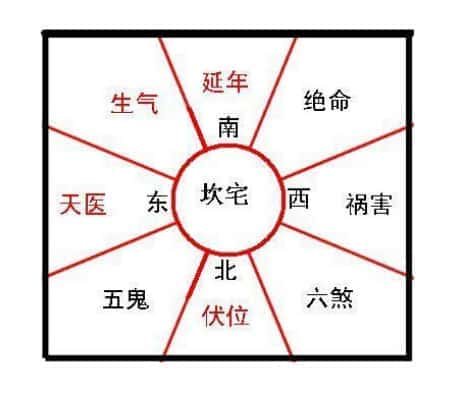 离宅:大吉(生气方)在正东方,次吉(延年方)在正北方,中吉(天医方)在东南方,小吉(伏位方)在正南方;大凶(绝命方)在西北方,次凶(五鬼方)在正西方,中凶(六煞方)在西南方,小凶(祸害方)在东北方。