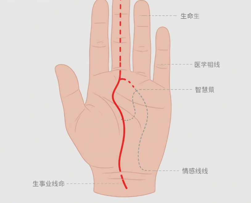 在手相学中,事业线(也称命运线)代表一个人一生的职业发展、社会成就和人生轨迹。末端断开,通常预示着: